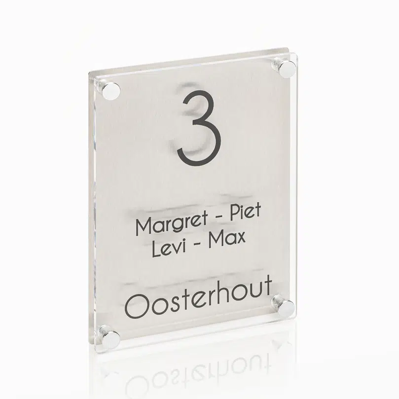 De combinatie van materialen zorgt voor een unieke uitstraling die je niet snel ergens anders vindt. Het RVS geeft het bordje een luxe, tijdloos karakter, terwijl plexiglas zorgt voor kleur en diepte. Samen vormen ze een bord dat zowel modern als duurzaam is. Bovendien is dit type bord onderhoudsvriendelijk en bestand tegen alle weersomstandigheden.