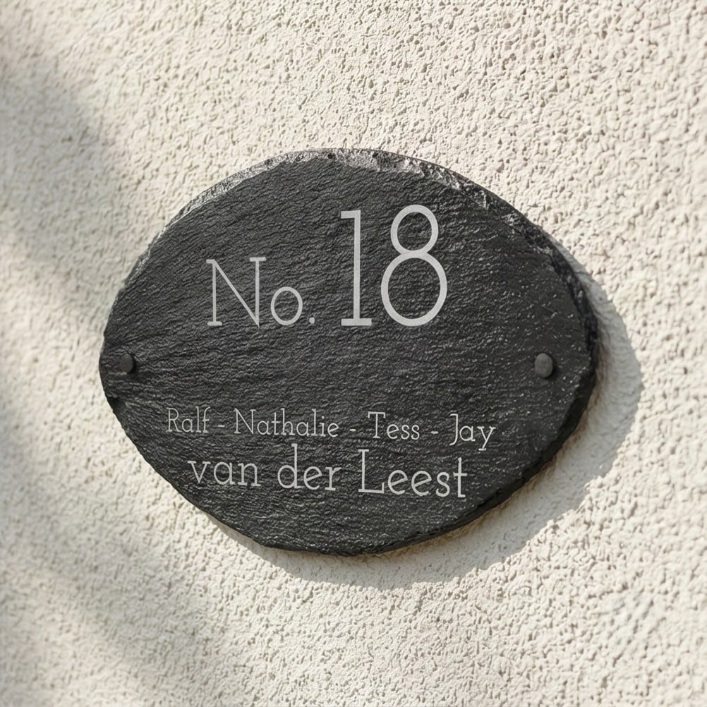 Naambord Leisteen 30 x 20 cm ovaal met gaten is een natuurstenen naambord met een karakteristieke uitstraling! Bij dit model hebben de randen een ruwe afwerking. Het ontwerp wordt met een lasergravure op het leisteen gezet, waardoor naam en huisnummer lichtgrijs kleuren.