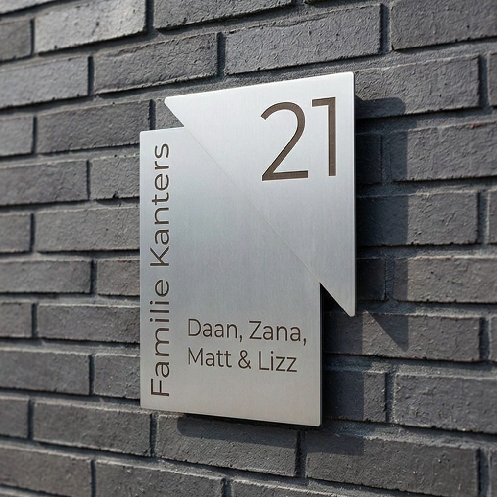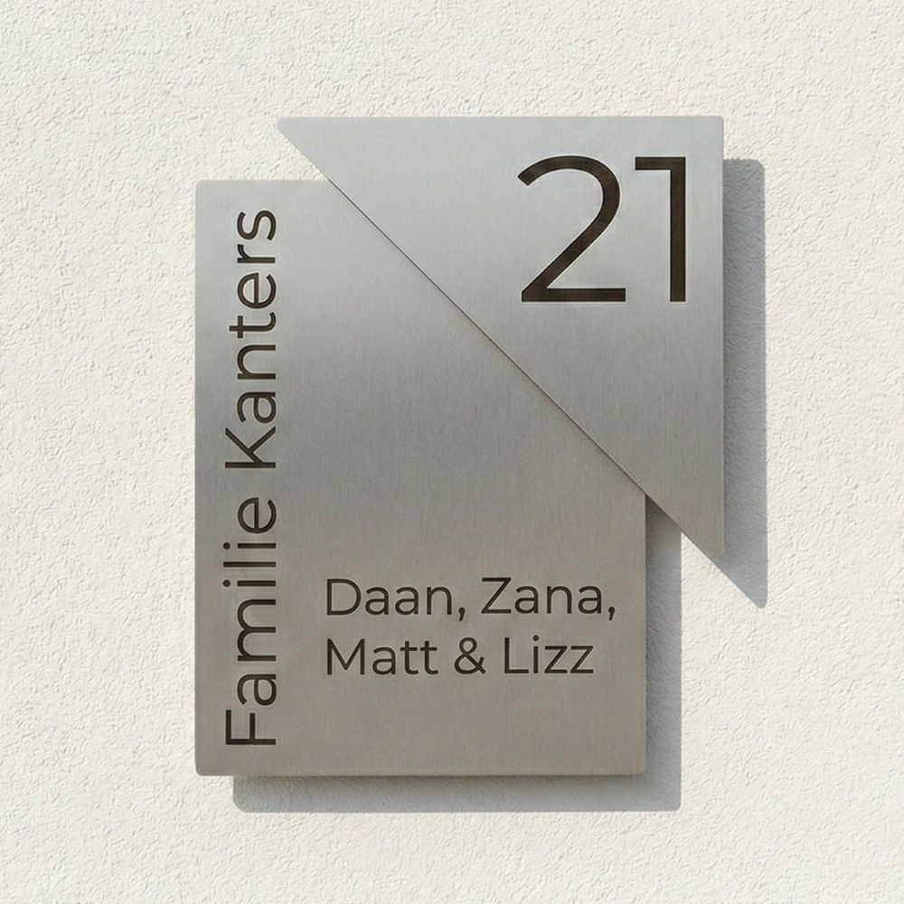 Een stijlvol RVS naambord met een uniek ontwerp! Dit model van 15 x 20 cm bevat een zwevende RVS driehoek die aan de rechterbovenzijde 2 cm oversteekt. Tussen de lagen zit een subtiele verdikking van 5 mm wat zorgt voor een mooi diepte effect. Naam en huisnummer worden in het materiaal geëtst. De gravure kleurt daarbij zwart, wat zorgt voor een mooi contrast.
