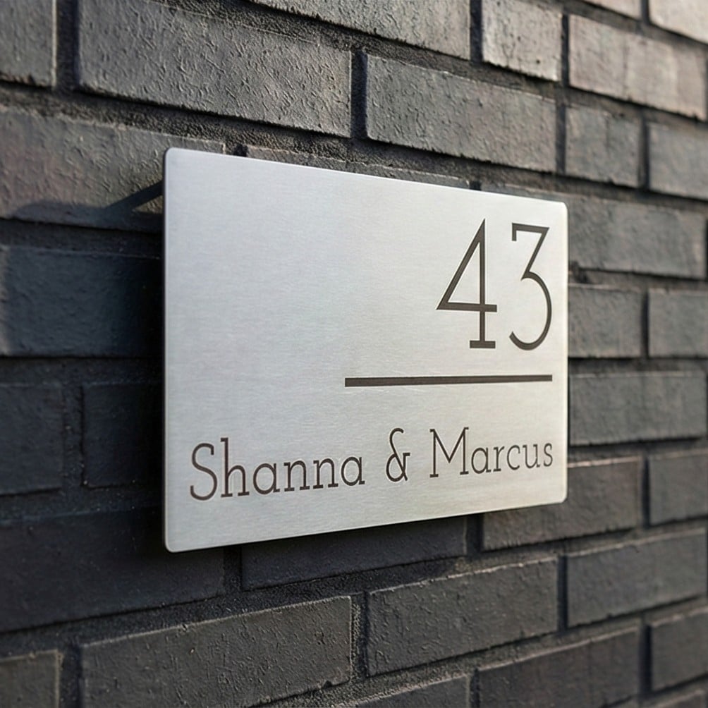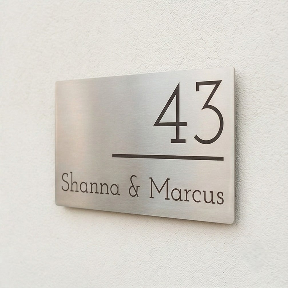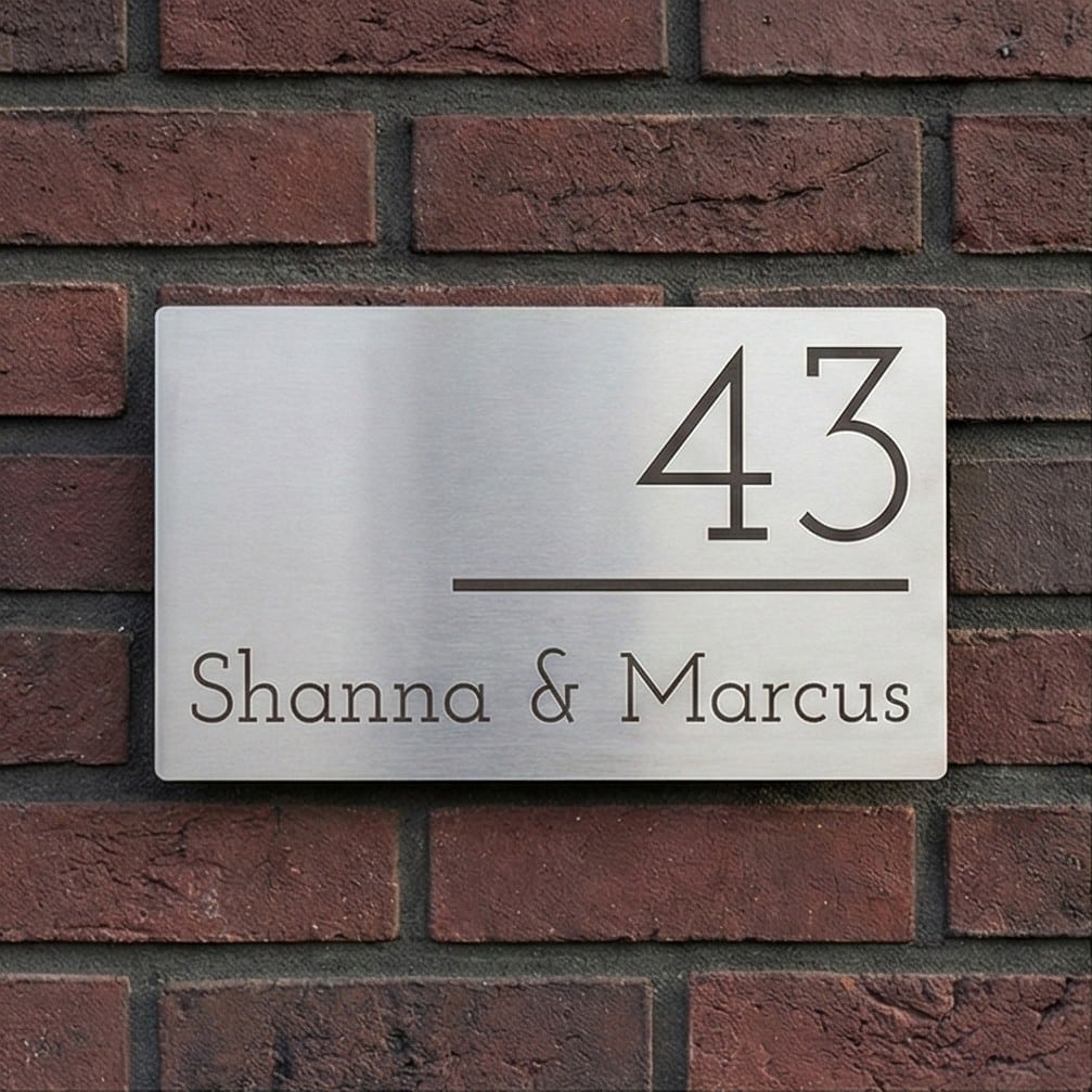 Naambord RVS 22 x 13 cm is een stijlvol naambord. Het bord is gemaakt van 2 mm roestvrij staal, heeft licht afgeronde hoeken en strak afgewerkte randen. Naam en huisnummer worden op het materiaal geëtst, hierdoor kleuren deze zwart. Een verzorgd en kwalitatief naambord voor aan jouw voordeur.