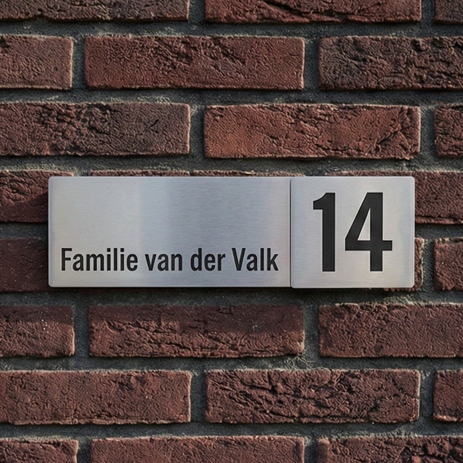 Een stijlvol RVS naambord met een uniek ontwerp! Dit model van 30 x 10 cm heeft aan de rechterzijde een verhoogd element van 10 x 10 cm. Tussen de lagen zit een subtiele verdikking van 5 mm wat zorgt voor een mooi diepte effect. Naam en huisnummer worden in het materiaal geëtst. De gravure kleurt daarbij zwart, wat zorgt voor een mooi contrast.