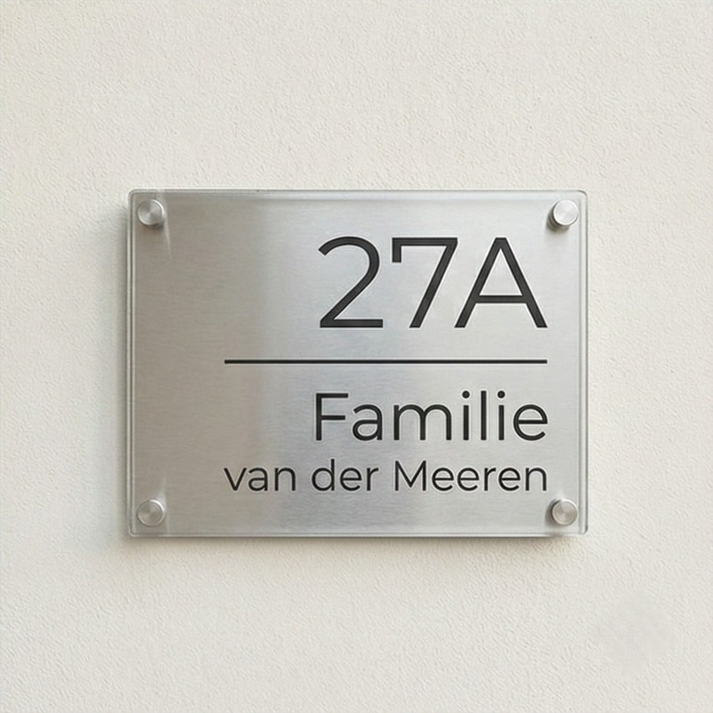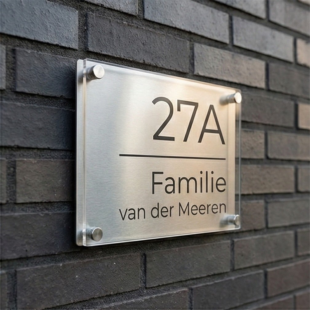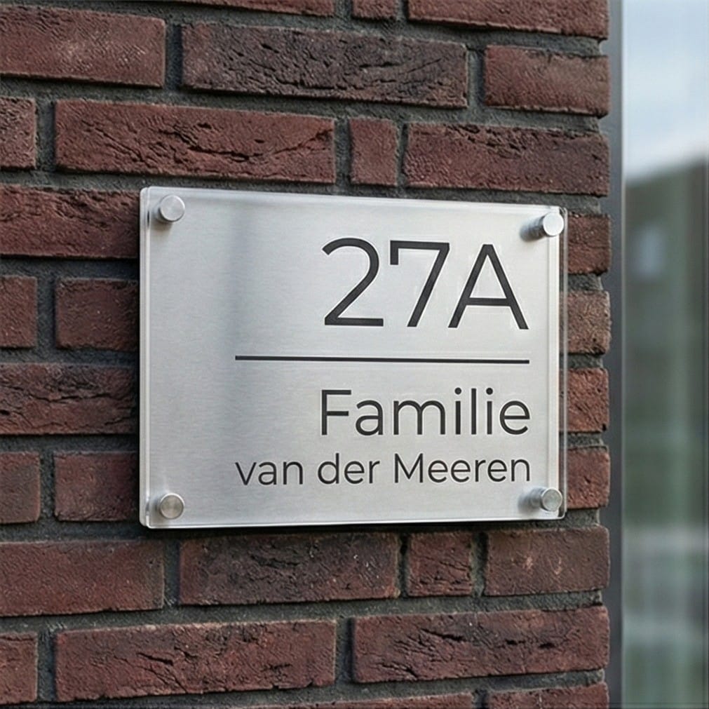 Een stijlvolle en gelaagde uitstraling aan jouw voordeur! Dit model van 20 x 15 cm bestaat uit een transparante plexiglas voorplaat van 5 mm en een RVS achterplaat van 2 mm. Afstandshouders zorgen voor een mooi diepte effect en maken dit naambord tot een prachtige aanvulling op jouw gevel.