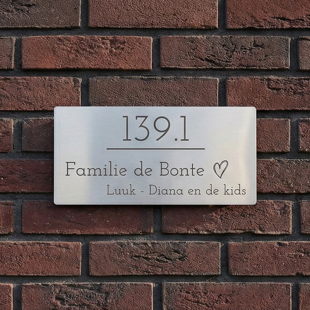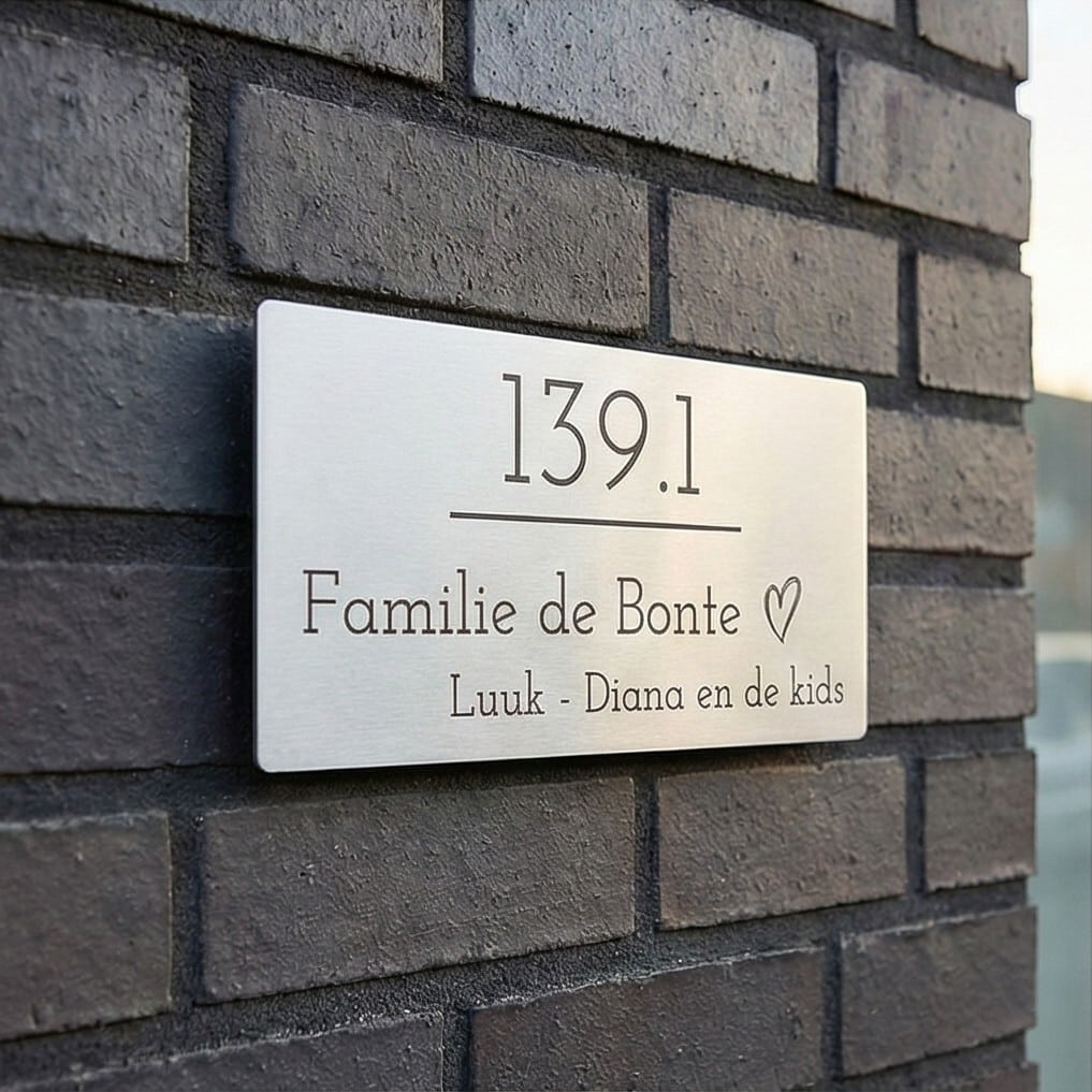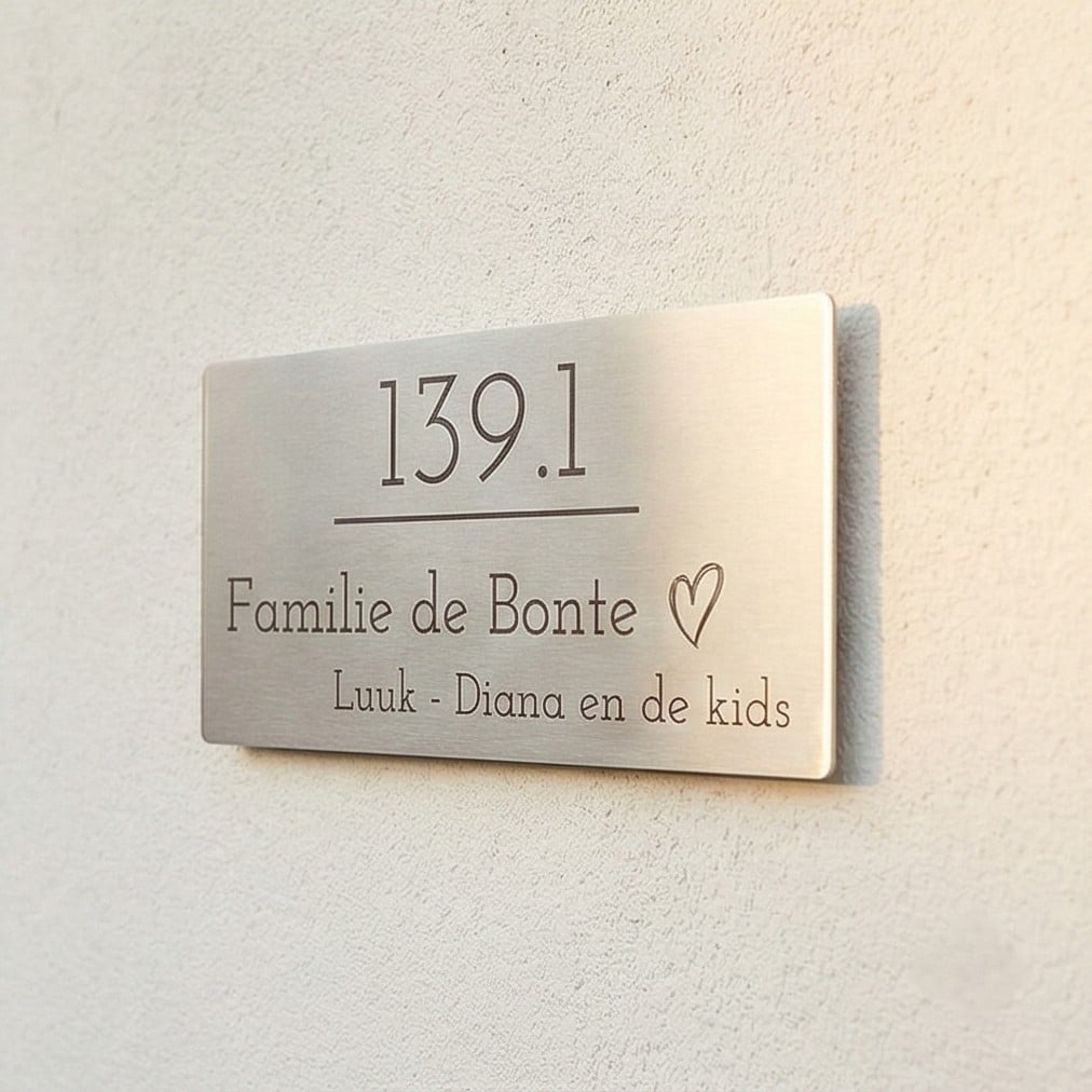 Naambord RVS 20 x 10 cm is een stijlvol naambord. Het bord is gemaakt van 2 mm roestvrij staal, heeft licht afgeronde hoeken en strak afgewerkte randen. Naam en huisnummer worden op het materiaal geëtst, hierdoor kleuren deze zwart. Een verzorgd en kwalitatief naambord voor aan jouw voordeur.